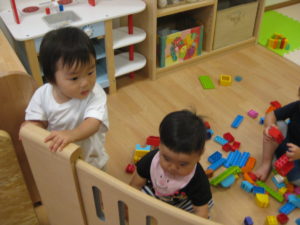 一人ずつ絵の具スタンプをしたので、待っているお友だちはブロックで遊びました。