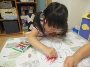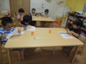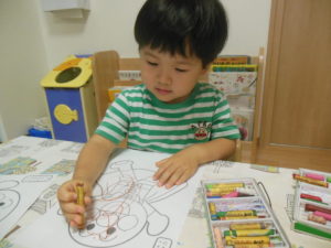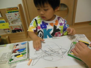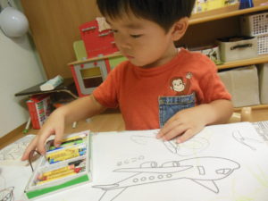 タンバリン組さんはアンパンマンと飛行機の塗り絵を用意し好きな方を選び塗り絵をしました。