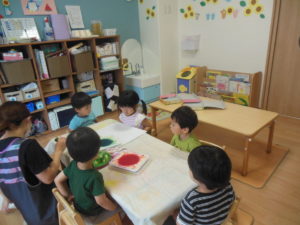 オクラやきゅうりや玉ねぎ等、様々な野菜が登場に、興味を持って見ていました。