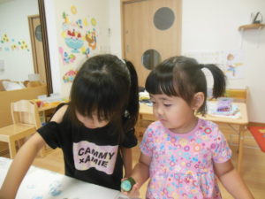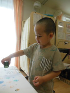 違う色や模様をスタンプを見比べています。