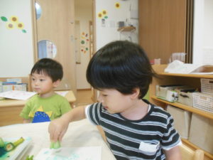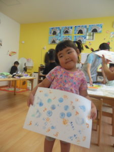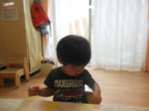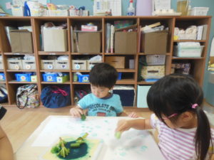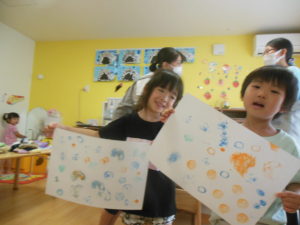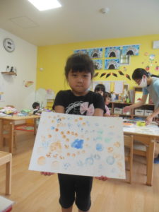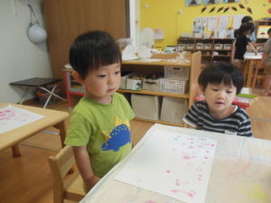 野菜スタンプをした後、園庭で水遊びをしました。