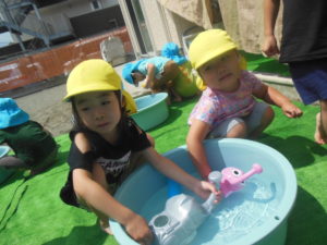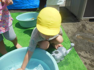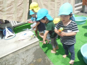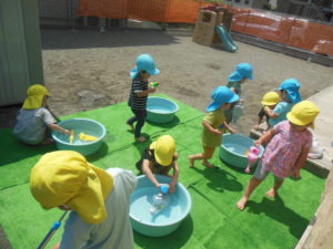 戸外は気温が上がり、冷たい水に手や足が触れると、「冷たい~!」と喜びの声があがります。