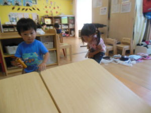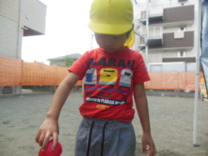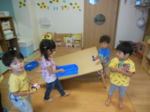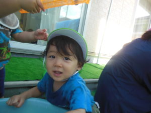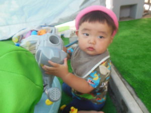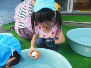 水を上から流して、お友だちが水に触れたり、水の出る玩具が人気で、仕組みを見たりして楽しみました。