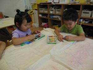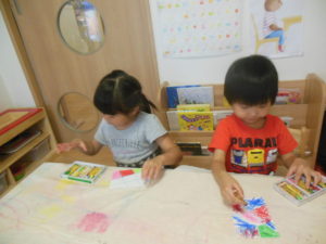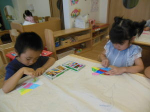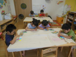 今日は、クレヨンで色を塗る所まで取り組みます。
