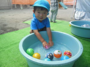 玩具のボールやじょうろを手に取って触ったり、水の感触を楽しんだりしました。