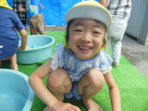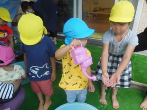 タンバリン組さんとピアノ組さんの水遊びです。