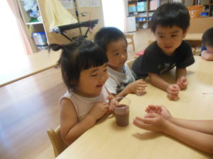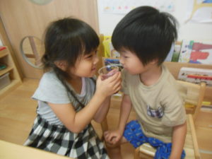 身を乗り出して見て興味深々!水が変わっていくのを観察したり、匂いを嗅いだりして楽しみました♡