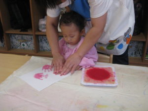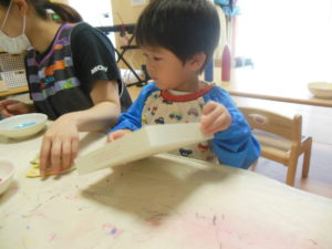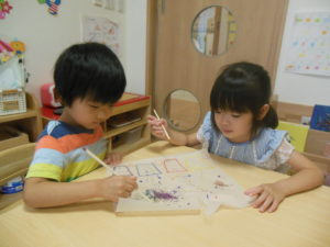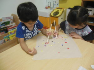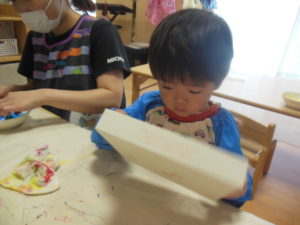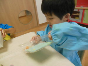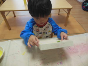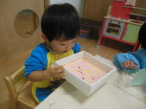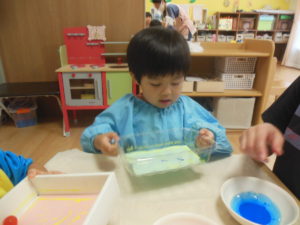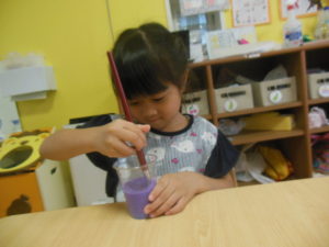 ピアノ組さんは、クッキングシートの上に絵の具を垂らし、絵と同じ色のコップに割りばしで移しました。