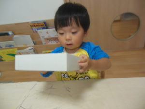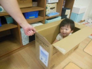 タンバリン組さんは、段ボールで電車ごっこも楽しみました。