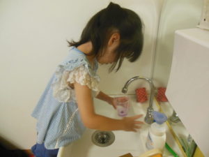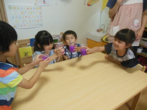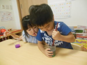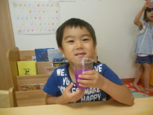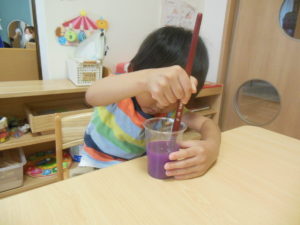コップに水と絵の具を入れて混ぜ、ジュースを作ります。