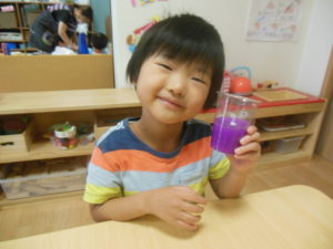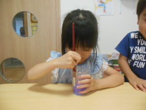 2色目の絵の具を入れて混ぜると、オリジナルドリンクの完成です!