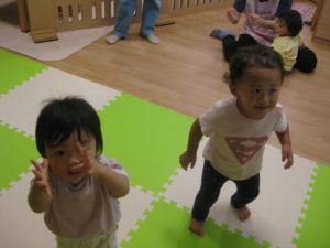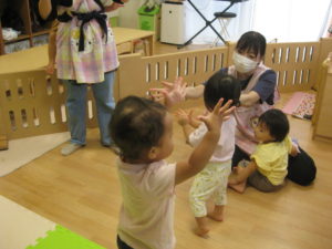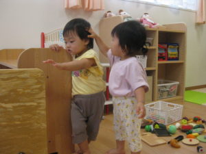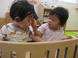 お友だちの近くに行ったり頭を撫でたりして、関わりを持つ姿が見られます。
