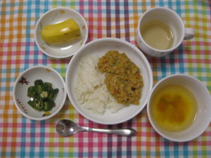 今日の給食は、夏野菜のチーズドライカレー・おくらのおかか和え・コンソメスープ(カボチャ たまねぎ)