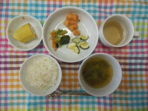 今日の献立は…ごはん、鮭のチーズパン粉焼き、小松菜とツナの和えもの、焼きズッキーニ、みそ汁(じゃがいも、わかめ)、バナナでした。