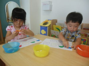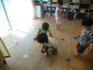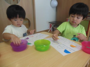 タンバリン組さんは色集めや同じ場所に色のシールを貼る遊びをしました。