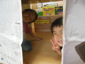 次はみんなが大好きな新聞紙を使ってお家を作りました。