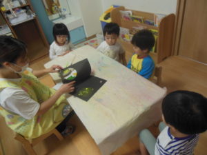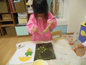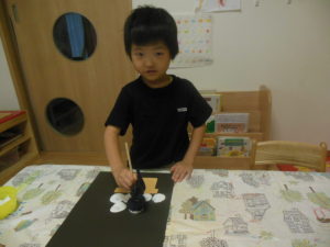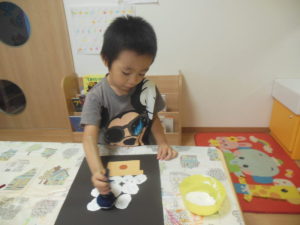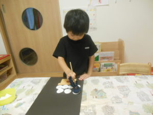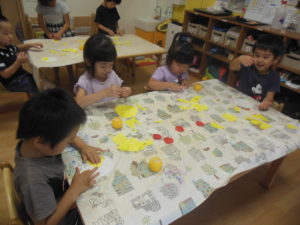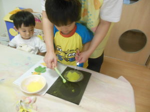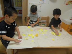 ピアノ組さんは、小さくちぎった折り紙をのり付けして貼ったり、タンポでスタンプをしたりして、製作をしました。