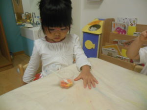 片栗粉と水、絵の具を混ぜて遊びました。