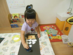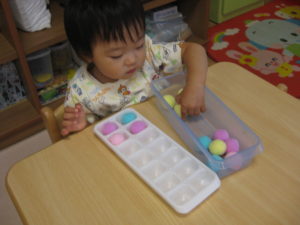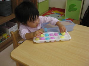 カラフルなポンポンを、くぼみに入れていきます♪