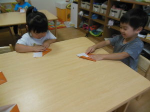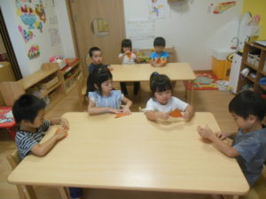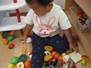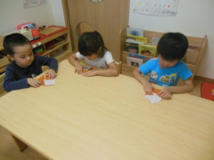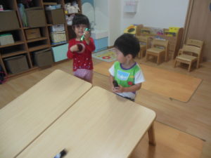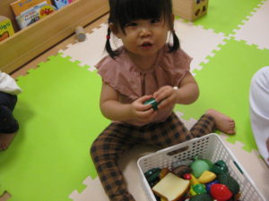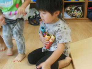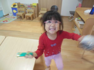 午前のおやつが終わると、外へ出る準備を始めようとした子どもたちでしたが、室内遊びを楽しみました!
