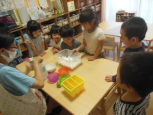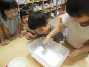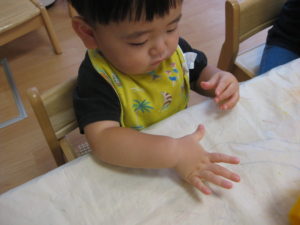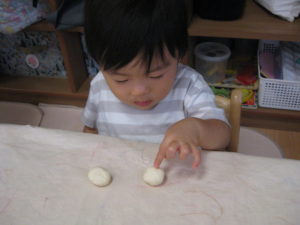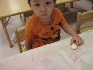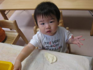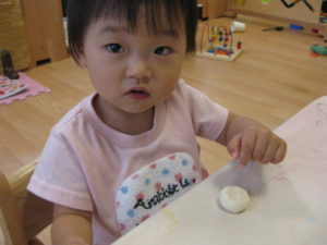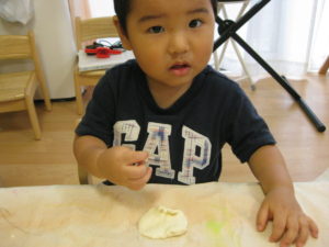 小麦粉粘土ははじめはじーと見たり、なかなか触れないお友だちもいましたが、触ってみると感触を楽しんでいました(*^^*)