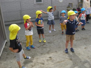 リズム体操を園庭でしました。お外は気持ち良いですね。自然と笑顔がこぼれます。