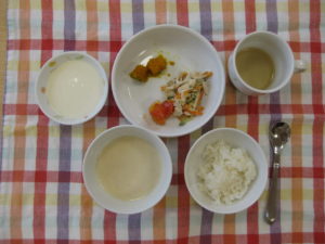 今日の給食は、ご飯、バンバンジー、かぼちゃの胡麻和え、コーンスープ、ヨーグルトでした。