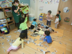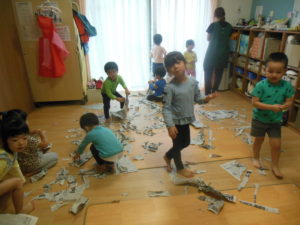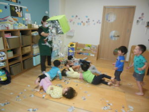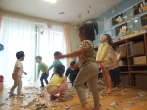 ちぎったらみんなで上に投げて、いっせいのせーで雨!!