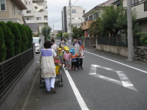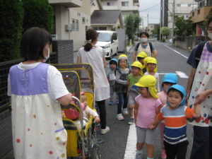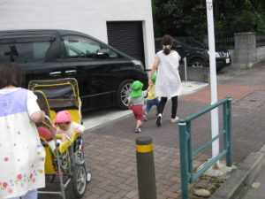 たくさん電車に手を振った後、保育園へ帰園途中にお散歩へ出掛けるタンバリン・ピアノ組さんに会いました♡