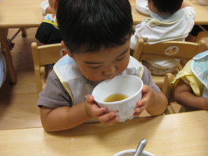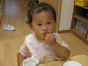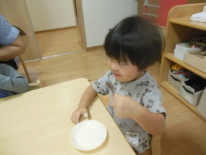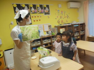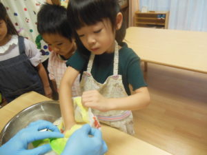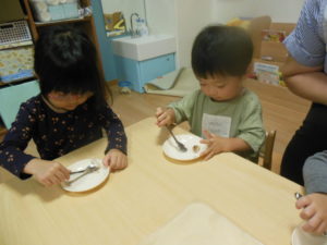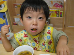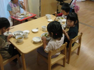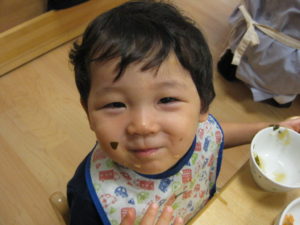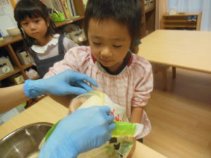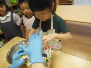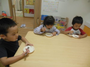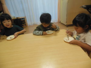みんなで試食、嫌がる子も無く、美味しい!とよく食べました。お替りください、皮も食べたい!と賑やかにいろんな声が聞こえました。