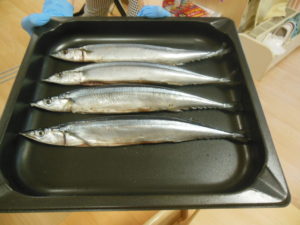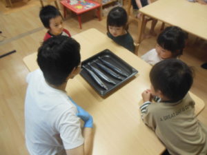 焼く前の生のさんまをみんなで観察しました。
