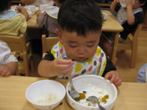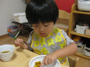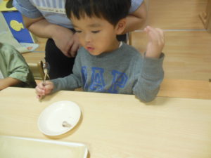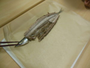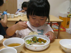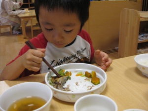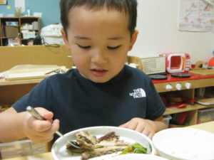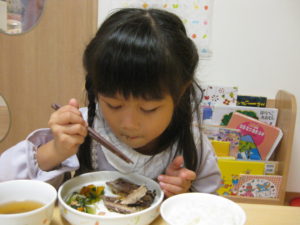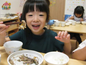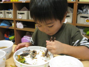 幼児さんは先生にほぐすのを手伝ってもらいましたが、自分で小骨を上手に除け、夢中で食べていました。