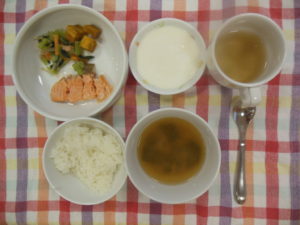 今日の給食は、【ごはん、さんま/さけの塩焼き、小松菜とツナの和え物、ゆでかぼちゃ、みそ汁(切り干し大根、わかめ)、ヨーグルト】でした。