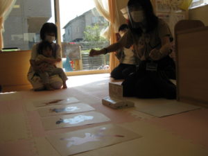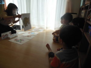 絵カードの隠れた動物を考え、正解すると拍手をして喜びました。