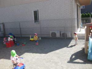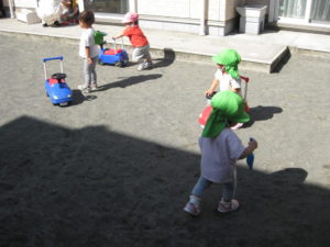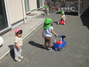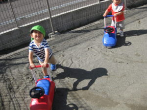 英語の後は、園庭でコンビカーに乗ったり押したりして遊びました。