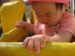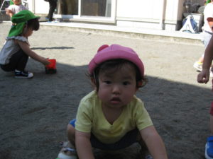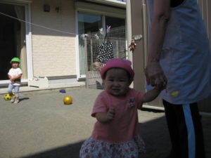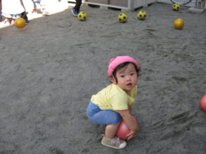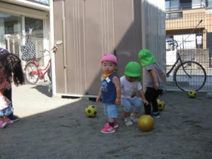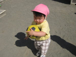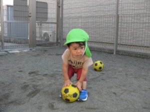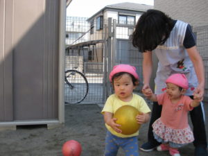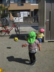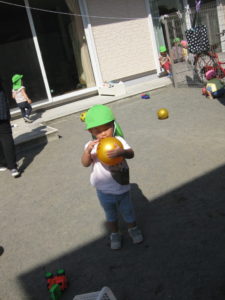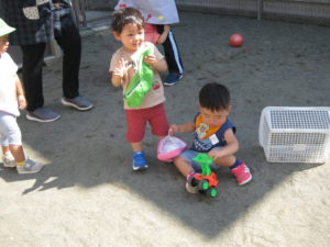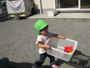 園庭で遊びました😊ボールや砂遊びをしてみたり、時には、かごにオモチャを入れて運んでみたりと