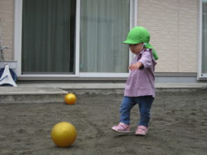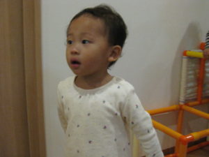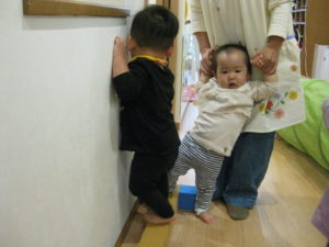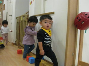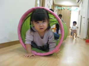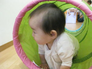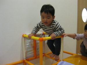 廊下にジャングルジム、トンネル、平均台を出して遊びました。