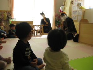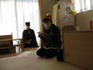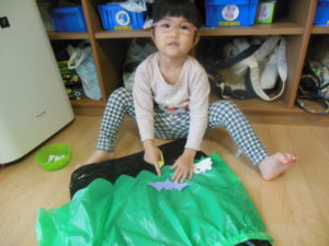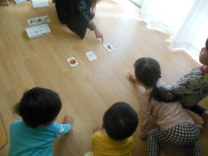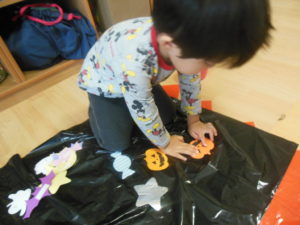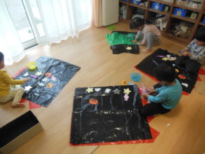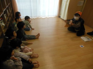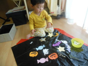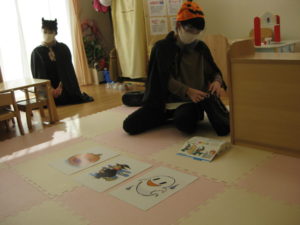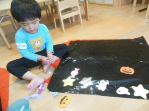 かぼちゃや猫、コウモリが登場するハロウィンじゃんけんや、絵カードの下に隠れているキャンディーを探すゲームをしました。