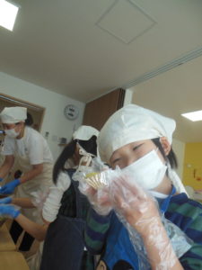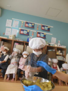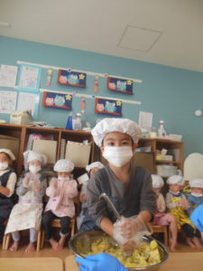 給食室で蒸したさつまいもを順番でつぶします☺