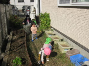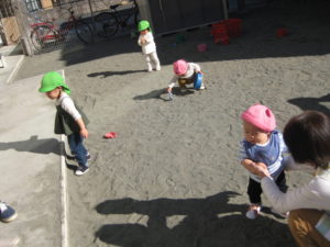 英語が終了した後は、園庭で遊びました。畑の周りで、好きな石を拾いアイスクリームに見立てて