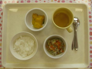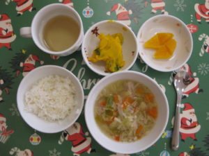 ご飯、肉団子と野菜のスープ煮、かぼちゃのミルクバター煮、オレンジでした😊