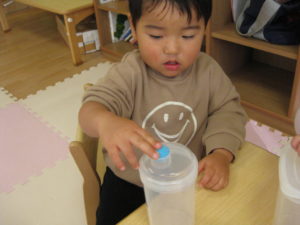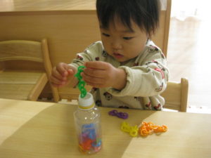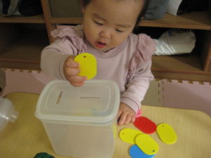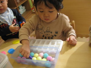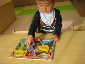 好きな遊びを自分で持ってきて、遊び終わるとあったところに戻そうとする姿が見られます!