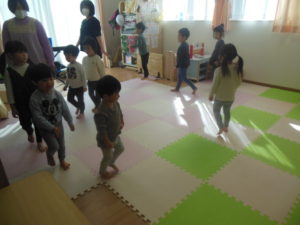 手を繋いで輪になったり、音楽に合わせてスキップやジャンプをして楽しみました。