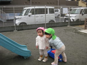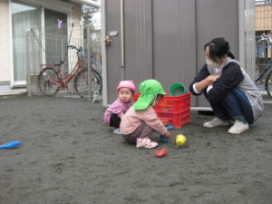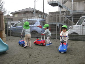 園庭でコンビカーや砂遊びをしている、カスタネット組さんとスズ組さんです。
