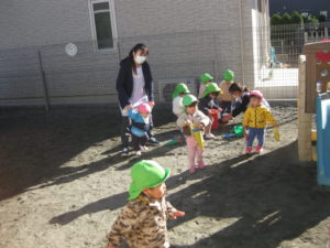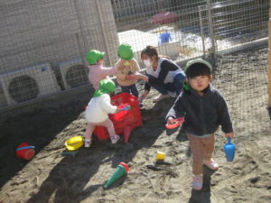 英語の後では、園庭でお砂遊び、アイスクリームや、バケツに砂を沢山入れて運んだりして遊んでました。