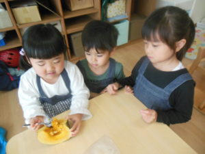 大根や人参を洗ったり、スプーンでかぼちゃの種取りをしていきます🥕