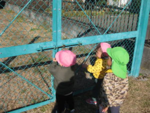 フェンスの向こう側を見ようと、隙間から覗きます。