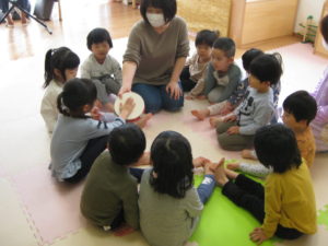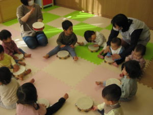ピアノ組さんとタンバリン組さんもタンバリン等の楽器を鳴らしたり、曲に合わせて身体を動かしたり、友だちとグループを作り一緒に行ったりして楽しんでいましたよ!