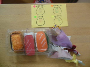 お花を選んで、お寿司をもらって、ゲームにジュースと大喜びでした!!