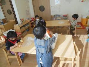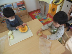 玉ねぎが人気で頑張ってむき、むけると嬉しそうに「できたよ」と見せてくれます。